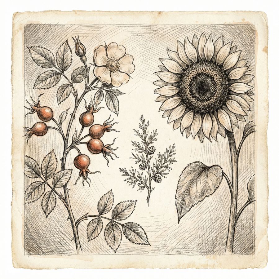 Wrapped in cloth at the back of a closet. Plant entries in her handwriting. Sketches in the margins. Remedies for every complaint — sleep, joints, weight, skin, fog, grief. Passed down from women who never had the word "menopause" but had a hundred ways to move through it.